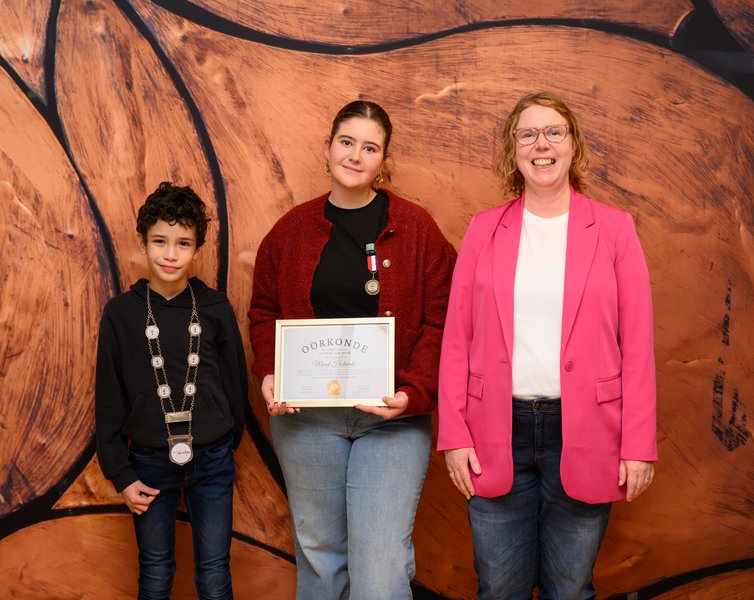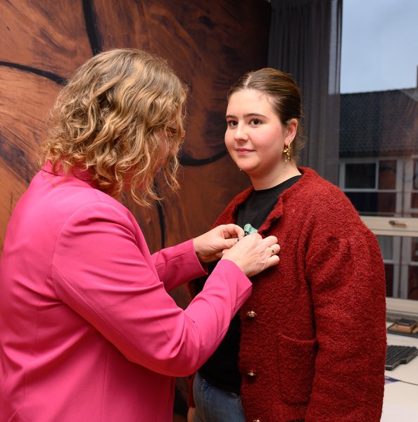 Als verrassing werd Maud gisteren naar het gemeentehuis gebracht, waar zij het lintje ontving uit handen van de jeugdburgemeester en wethouder Mariƫlle Doremalen.