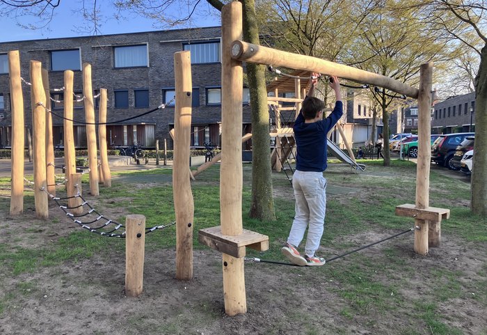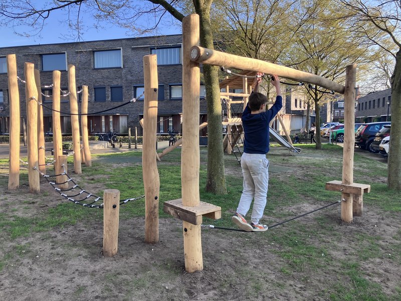 De oude speeltoestellen waren aan vervanging toe. Samen met buurtbewoners is gekozen voor stoere houten speeltoestellen gemaakt van een duurzame houtsoort.